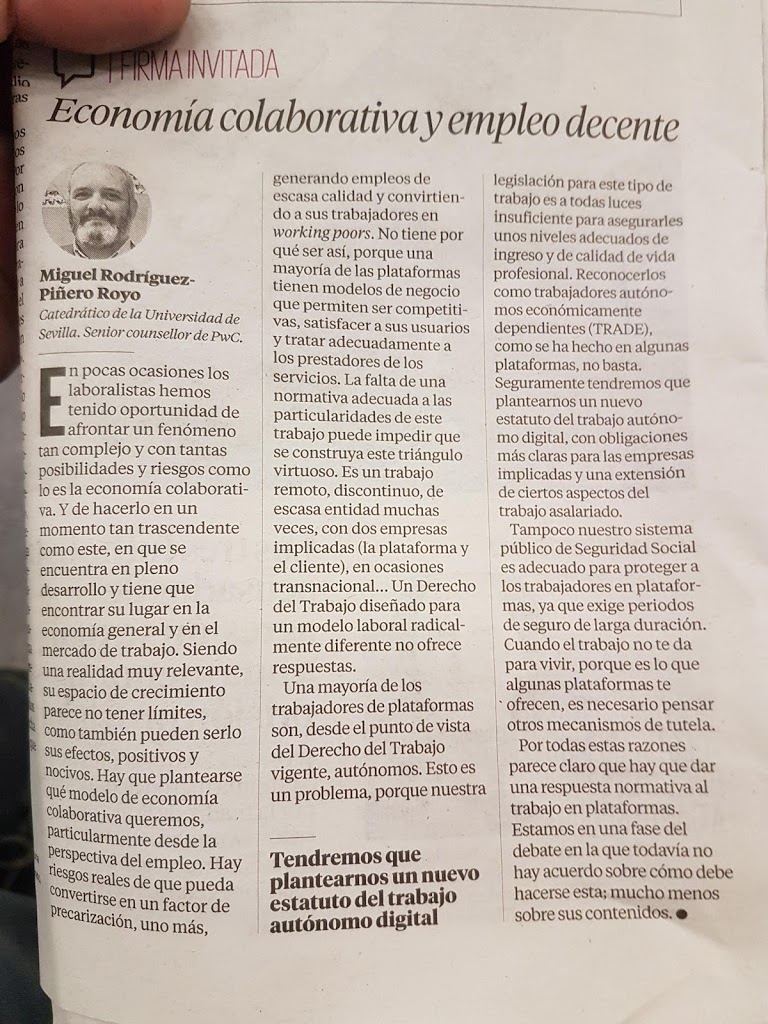 El artículo se llama. «Economía colaborativa y empleo precario» de Miguel Piñeiro Catedrático de la universidad de Sevilla… No pone que especialidad