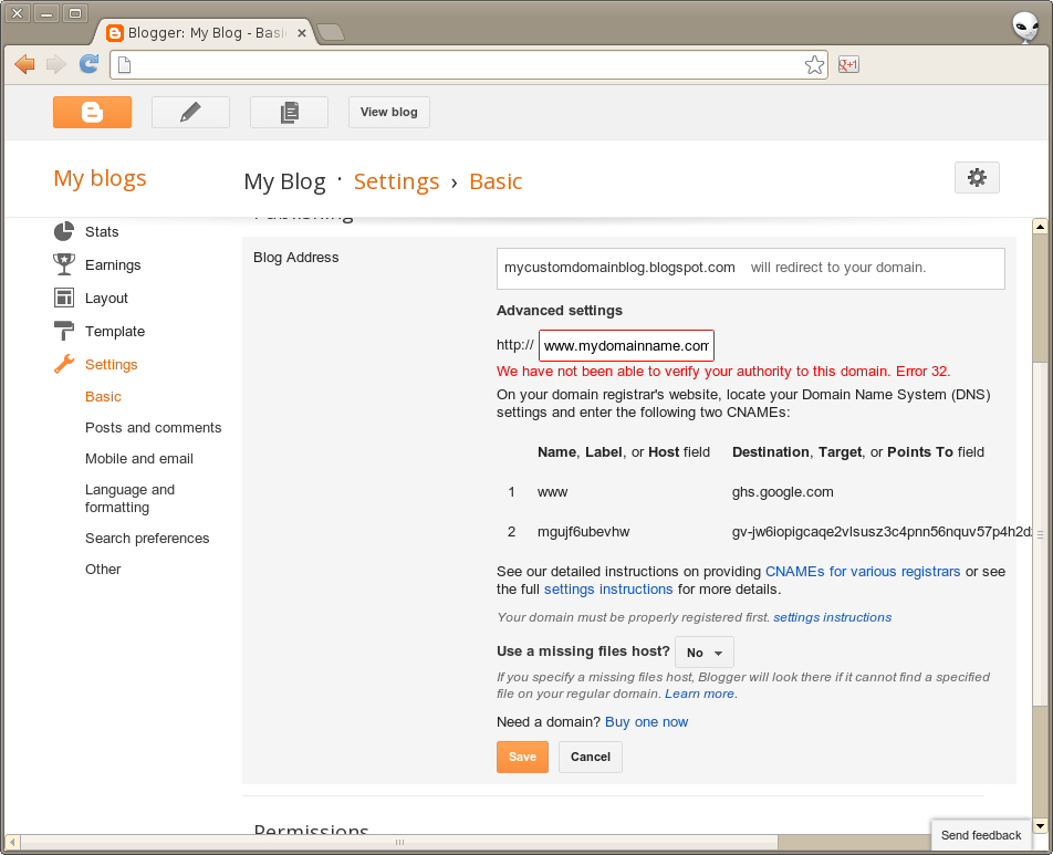 Una vez finalizada la actualización, vuelva a blogger.com, de nuevo a las configuraciones avanzadas se muestra en el paso 1, escriba «www.» + Tu nombre de dominio como «www.mydomainname.com» como la URL del blog personalizado y pulse Guardar. Blogger verificar la configuración de DNS y aplicar el nuevo dominio personalizado.