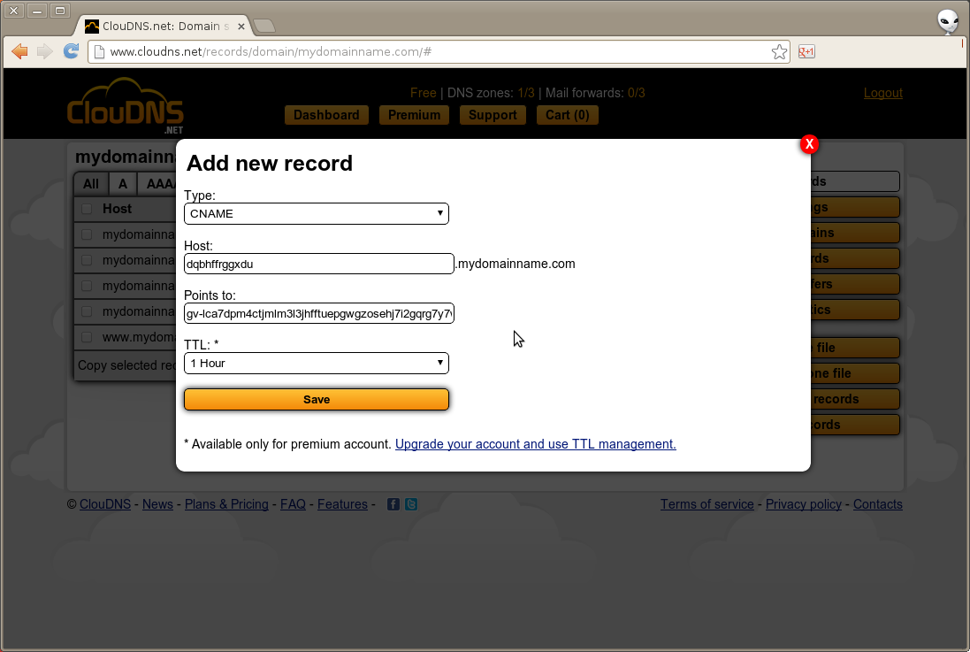 A continuación, agregue un CNAME segundo con los valores que se muestran por Blogger en la página de configuración.
